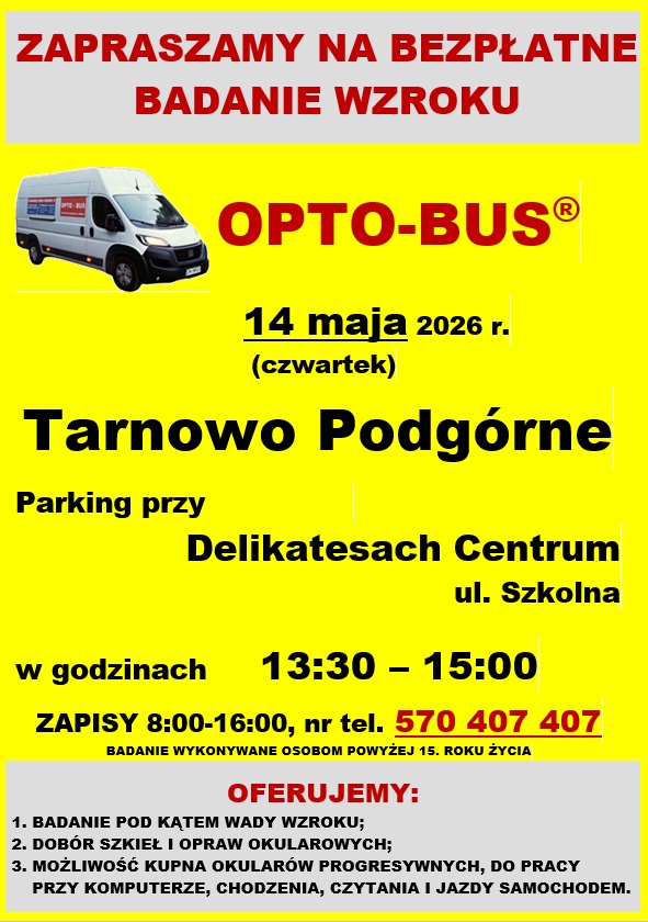 Mieszkańcy Gminy Tarnowo Podgórne mogą bezpłatnie zbadać swój wzrok. Akcja OPTO-BUSa odbędzie się 14 maja 2026 r. w godz. 13:30 – 15:00 na parkingu przy Delikatesach Centrum w Tarnowie Podgórnym (ul. Szkolna).
