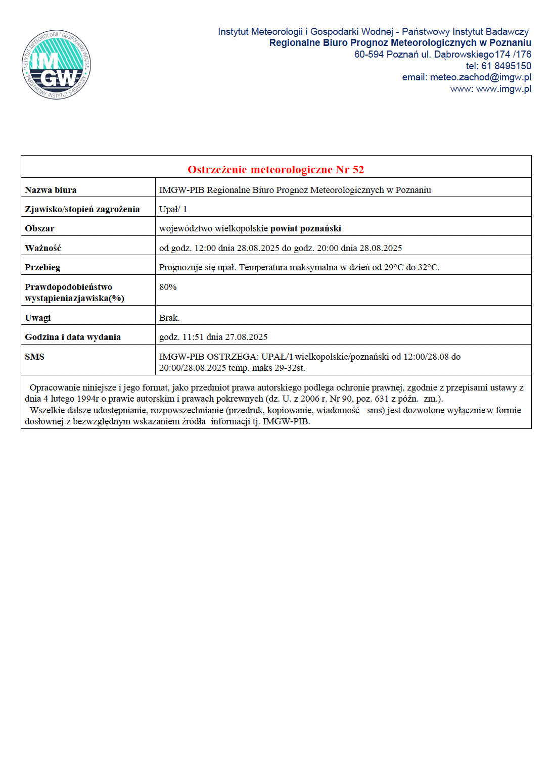 Instytut Meteorologii i Gospodarki Wodnej – Państwowy Instytut Badawczy Centralne Biuro Prognoz Meteorologicznych wydał ostrzeżenie meteorologiczne pierwszego stopnia o upałach dla powiatu poznańskiego.